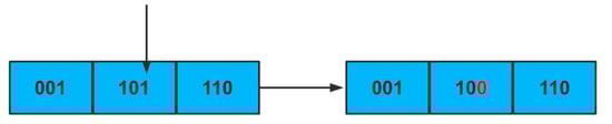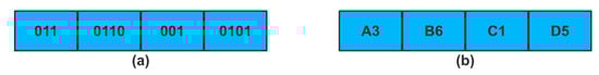 Now, we present the application of crossover operator based on the WOA coding scheme. Taking an alarm with four attributes as an example, the binary identity of the attribute field with two alarms is shown in Figure 9.