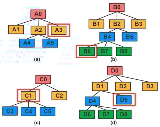 Hierarchical tree structure for attributes A, B, C and D. (a) three-layer tree structure of attribute A; (b) four-layer tree structure of attribute B; (c) three-layer tree structure of attribute C; (d) four-layer tree structure of attribute D.