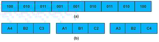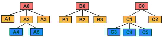 In Figure 6, there are three hierarchical trees corresponding to the three attributes of an alarm, respectively. If we need to finally obtain three cluster centers for this alarm set, which are , and , then one of our search agents can be encoded as shown in Figure 7a in the second coding method. Figure 7b shows the three cluster centers corresponding to this coding scheme.