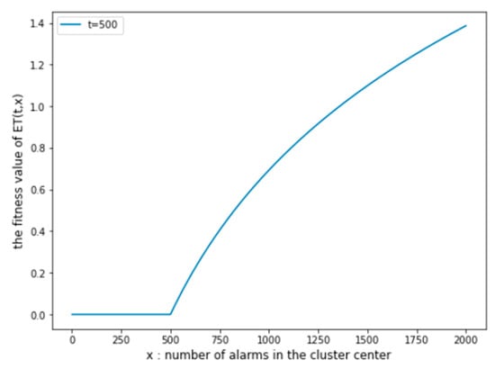 When , we think that the cluster contains too few alarms, and the cluster center should not be selected; when , we think that the fitness value of the cluster center increases with the increase in , and taking as an example, the image of the fitness function is shown in Figure 8.