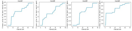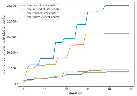 After verifying that WOAHC-L has excellent global search capability in alarm clustering, we continue to explore the use of WOAHC-L to solve the local clustering problem of alarm hierarchical clustering, that is, every time we call the WOAHC-L, an alarm cluster is obtained, which is obtained through the iterative search of WOAHC-L, according to the fitness function. Taking of 50 as the maximum number of iterations and the number of search agents of 10 as an example, we perform WOAHC-L four times and obtain four cluster centers successively from 50,801 alarms. The number of alarms contained in the four cluster centers varies with the number of iterations as shown in Figure 15.