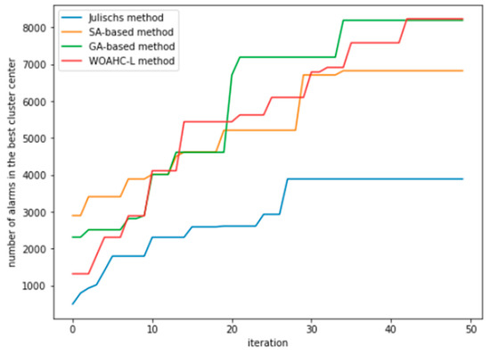 Meanwhile, in order to compare with other algorithms, we repeat the alarm clustering algorithm mentioned in the references [45,46,47] and compare it with WOAHC-L. In order to more intuitively feel the results of clustering, we use the number of alarms contained in the cluster center as the Y axis to compare the four algorithms. Please note that it is not accurate to rely only on the number of clusters contained in the cluster center to evaluate the quality of the clustering results. The quality of the clustering results is also greatly related to the distance between the alerts contained in the cluster center (called difference in some works), that is, the fitness function mentioned in the formula. The experimental results are shown in Figure 17.
