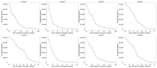 As the excellent performance of WOAHC-L in alarm reduction is proved by comparing with other algorithms, we explore the stability of WOAHC-L in clustering and the rule analysis of clustering results. In order to avoid the contingency of experimental results, we conduct eight experiments, where each experiment performs several WOAHC-L times until the number of remaining alarms no longer meets the clustering requirements. The results of the experiment are shown in Figure 18. The X axis represents the number of cluster centers, that is, the number of WOAHC-L calls, and the Y axis represents the number of remaining alarms in the original alarm set.