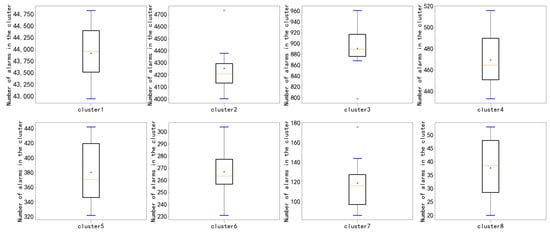As mentioned in Section 4.4, WOAHC-G only needs to be called once to obtain all the cluster centers, provided that the number of cluster centers need to be specified, which is a difficult problem. However, with the experimental results of WOAHC-L as a reference, we can choose an appropriate number of cluster centers as a parameter. Here, we set the number of cluster centers as eight, which is based on the above experimental results of the comprehensive consideration. Meanwhile, our search agent code is 72 dimensions (each cluster center contains nine attributes, a total of eight cluster centers). We still select 10 search agents to search for the cluster space. Other parameters of WOAHC-G are set as above, and the fitness function of the global version is selected, adding the influence of clustering coincidence degree. Under the same data set configuration, we conduct eight experiments and use a boxplot to represent the number of alarms in each cluster, as shown in Figure 19.