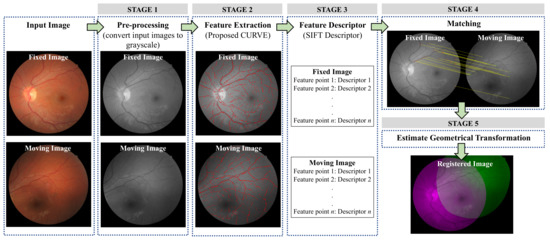 The CURVE-SIFT technique constitutes five main stages, as shown in Figure 1. Stage 1 converts the input images to grayscale. The proposed CURVE in Stage 2 extracts feature points from the input grayscale images, which also highlights the main contribution of this paper. Stage 3 computes the SIFT descriptor to describe the surrounding region of each CURVE feature point. From the computed descriptors, matches are established, and outliers are removed in Stage 4. Finally, Stage 5 estimates the geometrical transformation between fixed and moving images. The details of these stages are explained in the following sub-sections. The mathematical symbols and notation used in this section are listed in Appendix A (Table A1).