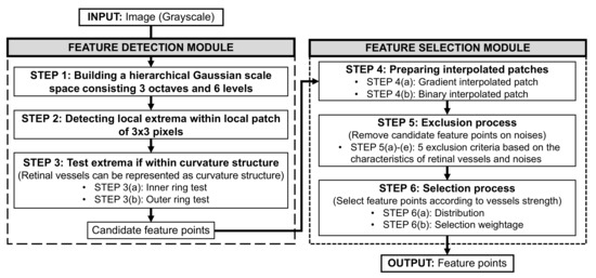 This sub-section describes the proposed CURVE to extract feature points on retinal vessels. CURVE is composed of feature detection and feature selection modules. The feature detection module detects candidate feature points according to the curvature shape of the retinal vessels. The curvature shape of the retinal vessels is observed when its grayscale image is depicted in 3D (see Table A2 in Appendix B). However, the detected candidate feature points are located on retinal vessels as well as noises. Therefore, the feature selection module removes the detected candidate feature points associated with noises by considering the unique characteristics of both retinal vessels and noises in intensity profiles. Then, the final feature points are chosen based on the strength of the retinal vessels. The steps in the feature detection and feature selection modules are summarized in Figure 2.