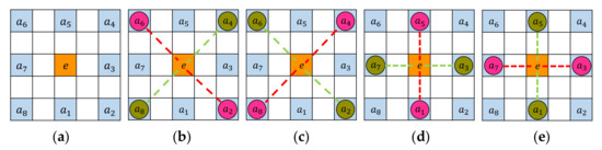 The inner ring test considers eight pixels surrounding an extremum as depicted in Figure 3a. Four out of eight pixels are tested at a time for patterns and , as shown in Figure 3b–e. These patterns are formed when the intensities of two opposing pixels are brighter (dark green dot) than the other two opposing pixels in orthogonal (pink dot). The extrema can pass this test with one or two patterns. Then, the central intensity value is estimated by taking the median value of four pixels if the extremum passes with one pattern, and eight pixels if it passes with two patterns. The extrema that failed the inner ring test are eliminated.