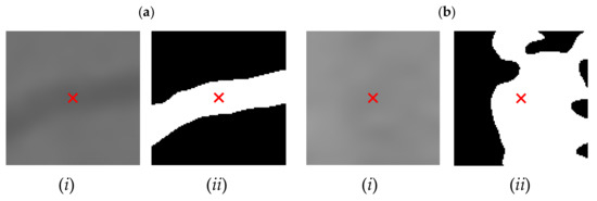 Examples of the (i) gradient and (ii) binary interpolated patches extracted from (a) retinal vessel and (b) noise. Red ‘×’ represents the position of the candidate feature point on the patch.