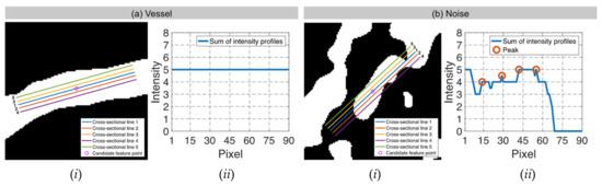 Retinal vessel in a binary interpolated patch forms a nearly straight and wide connected region, as depicted in Figure 7(ai). This characteristic can be represented by the sum of the intensity profiles extracted from five cross-sectional lines positioned along the main orientation of the patch. The , and orientation for these cross-sectional lines are chosen to best express the retinal vessel of various sizes in the patch. For retinal vessels, the sum of the intensity profiles appears as a horizontal line, as depicted in Figure 7(aii). Contrarily, the noise comprises an inconsistent connected region, as shown in Figure 7(bi), which results in the detection of peaks in the sum of intensity profiles. Therefore, a candidate feature point with peaks on the sum of intensity profiles is discarded.