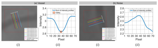 Exclusion criterion 2. (i) Cross-sectional lines and (ii) sum of intensity profiles for gradient interpolated patch with (a) retinal vessel and (b) noise. A candidate feature point is discarded if the sum of intensity profiles from gradient interpolated patch is without any valley as in (b)(ii).