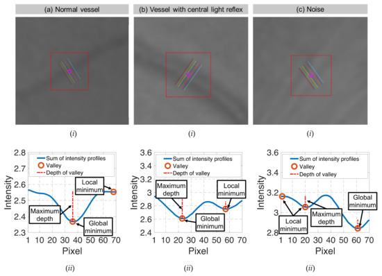 Exclusion criterion 3. (i) Cross-sectional lines and (ii) sum of intensity profiles for gradient interpolated patch with (a) normal retinal vessel, (b) retinal vessel with central light reflex and (c) noise. A candidate feature point is discarded when the valley with the maximum depth is a local minimum as in (c)(ii).