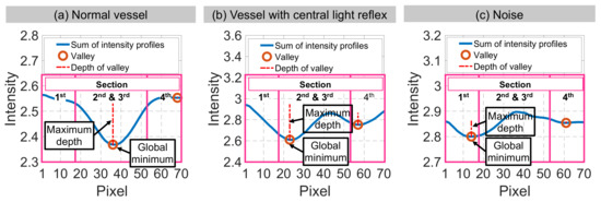 The valley with maximum depth and global minimum from STEP 5(c) is examined for its position on the -axis. The sum of the intensity profiles is divided into four sections of equal size. The valley with the maximum depth is expected to be at the second or third section on the -axis if a candidate feature point on a retinal vessel is either normal or with central light reflex as shown in Figure 10a,b Therefore, a candidate feature point is excluded if the valley with the maximum depth is located at the first and fourth sections, as in Figure 10c.