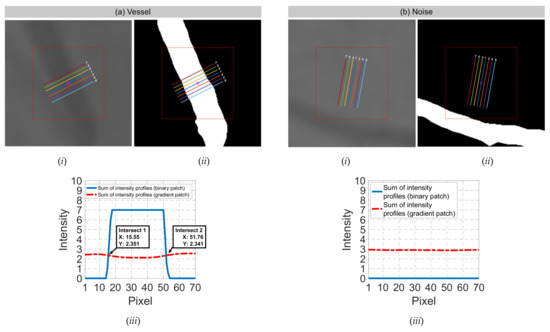 Exclusion criterion 5. Cross-sectional lines on (i) gradient and (ii) binary interpolated patches for (a) retinal vessel and (b) noise. (iii) The intersection between sums of intensity profiles from (i) and (ii). A candidate feature point is discarded when the overlaid sums of intensity profiles are apart from each other, as in (b)(iii).