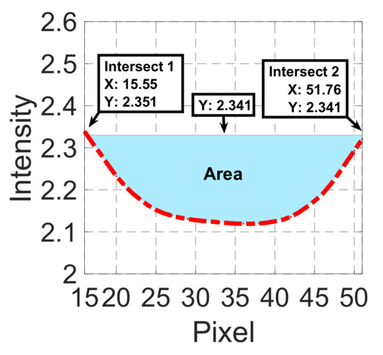 This criterion overlaid the sum of the intensity profiles from gradient and binary interpolated patches. The intersection can be found when a candidate feature point is located on a retinal vessel and vice versa, as depicted in Figure 11. Thus, the candidate feature point is discarded when the overlaid sums of the intensity profiles are apart from each other.