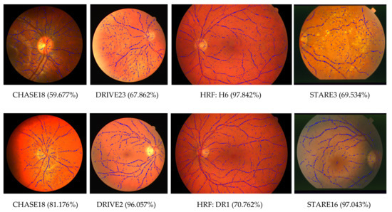 - Hoover, A.; Kouznetsova, V.; Goldbaum, M. Locating blood vessels in retinal images by piecewise threshold probing of a matched filter response. IEEE Trans. Med. Imaging 2000, 19, 203–210. [Google Scholar] [CrossRef] [PubMed] [Green Version]