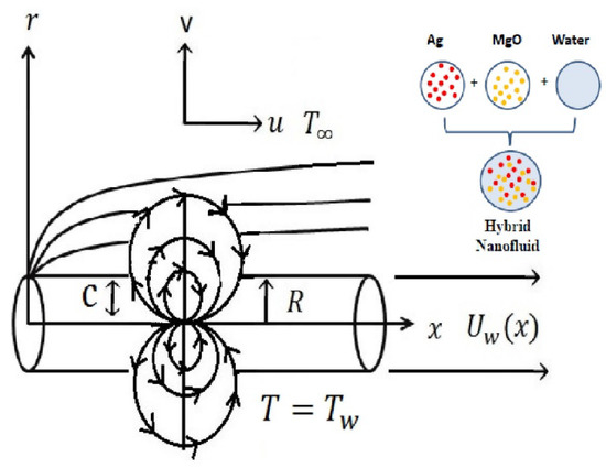 A nanofluid is made by combining tiny nanoparticles, such as metallic and non-metallic alloys or carbon nanotubes, with conventional fluids such as oils, water, or ethylene glycol. These fluids have improved thermal conductivity qualities and a higher heat transfer rate. With the growth of nanotechnology, a new type of liquid that is capable of supplying high heat transference for a variety of manufacturing industries is needed. With this in mind, a new type of liquid known as a hybrid nanofluid was created. A hybrid nanofluid is a type of nanofluid created by scattering many types of nanoparticles in the same base fluid. When compared to regular nanofluids and base fluids, hybrid nanofluids have superior thermal properties. Refrigeration, generator cooling, the automobile industry, electronic cooling, air conditioning, heat exchangers, biomedical applications, and nuclear system cooling are applications of these fluids. Numerous studies into the features of hybrid nanoliquid have been carried out as a result of these important applications. In the presence of a chemical reaction, Alshomrani and Ramzan [15] explored the influence of a ferromagnetic dipole in the flow of a hybrid nanoliquid through a stretching cylinder. Ahmad and Nadeem [16] presented the hybrid Casson nanoliquid flow across a lubricated surface approaching a stagnation point with entropy generation using a simplified mathematical model. Under the impact of thermal radiation, Maskeen et al. [17] demonstrated the heat transport and flow properties of an (Al2O3–Cu/H2O) hybrid nanoliquid across an extending cylinder. Abbas et al. [18] numerically studied the flow of a hybrid nanofluid with an inclined MHD stagnation point flow through a moving stretched cylinder. In this study, he extends the Xue model and Yamada-Ota model for hybrid nanofluid. Using the Runge-Kutta (RKF 4) numerical approach, Gholinia et al. [19] investigated the steady boundary layer laminar flow of CNTs/(C2H6O2–H2O) nanomaterial hybrid fluid on a porous stretched cylinder with the influence of a magnetic force. In a hybrid nanofluid flow, Waini et al. [20] investigated the stagnation point flow towards a stretching/shrinking cylinder. Alumina (Al2O3) and copper (Cu) were used as hybrid nanoparticles in this study, with water as the base fluid.