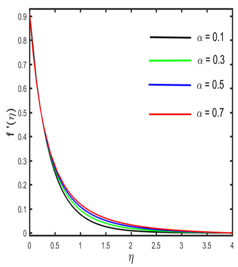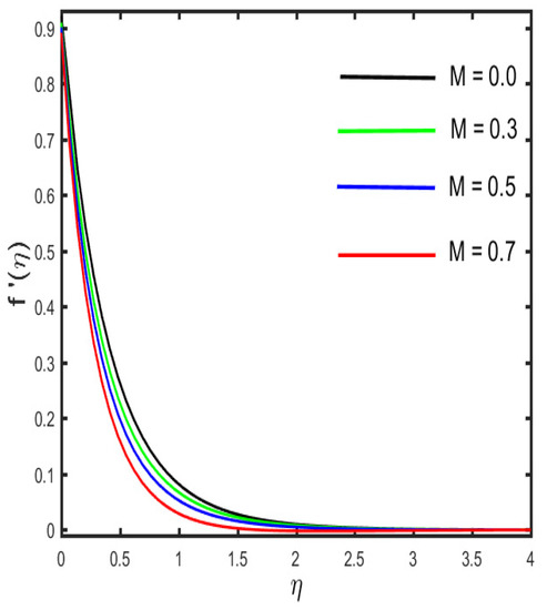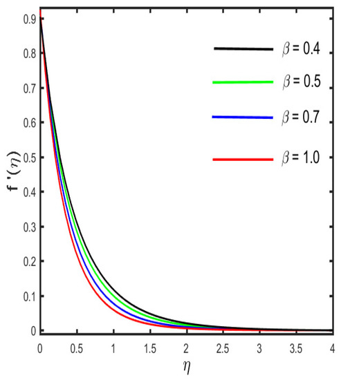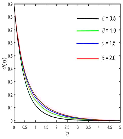 The variation in the velocity profile for the several parameters is depicted in Figure 2, Figure 3, Figure 4, Figure 5 and Figure 6. The results, indicated in Figure 2, are that the velocity profile shows a decreasing trend for the improved values of the Casson fluid parameter, while a stronger estimation of shows the opposite trend on the velocity profile, which is lessening (see in Figure 3). The reason behind this is that the stronger resistive force occurs between the molecules of the solid surface at the wall by the escalation of the curvature parameter. Further, it is found that by the expansion of (the curvature parameter), the radius of the cylinder condenses, thereby the low resistance is provided to the fluid motion, and hence, the fluid velocity rises. The diversion in the velocity sketch against the various values of the magnetic parameter and solid fraction parameter is found in Figure 4 and Figure 5. It is clarified in Figure 4 that due to the occurrence of the magnetic effect, the Lorentz force appears, which yields the retardation effect whereby the fluid velocity declines. Further, the result of Figure 5 illustrates the reducing behavior by the escalation of . The influence of (velocity slip parameter) on the velocity profile is designated in Figure 6. The figure shows that declines in the fluid velocity due to increasing values of are related to boundary layer thickness. The reason behind this is that the velocity near the cylindrical surface is not the same as the velocity away from the surface, and, therefore, the fluid velocity diminishes.