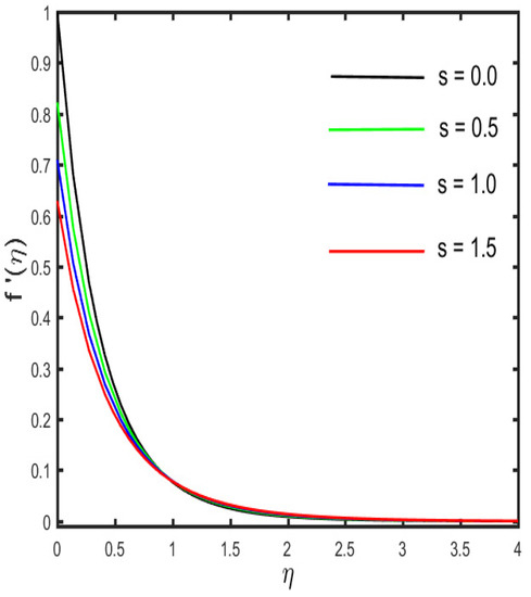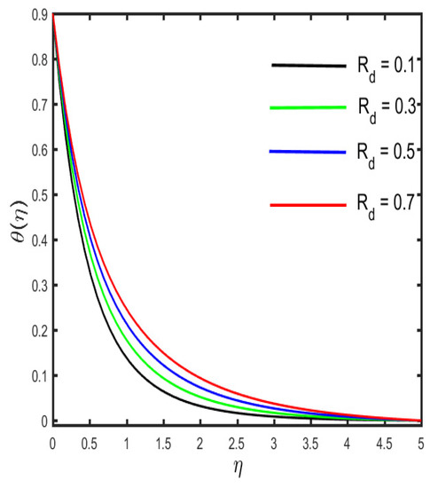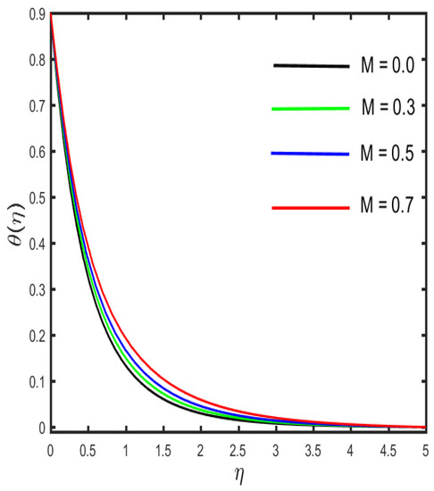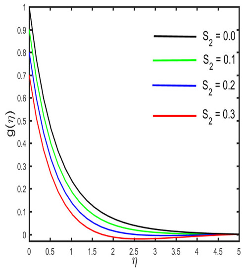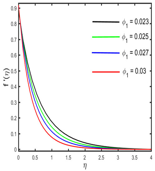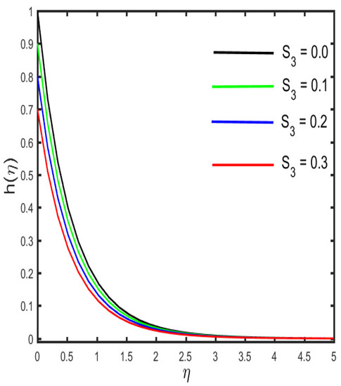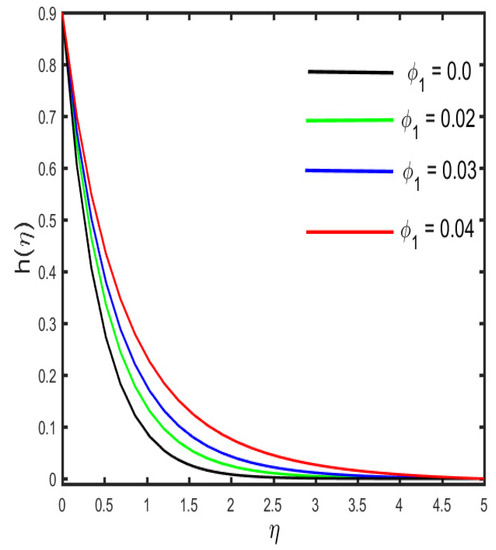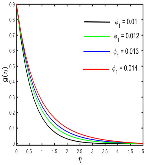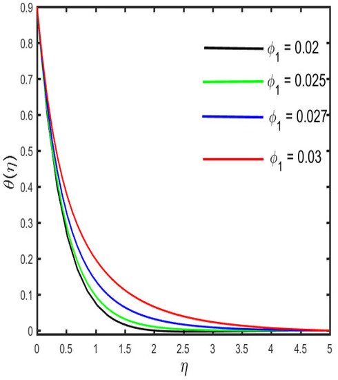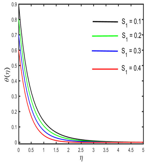 The outcomes of several parameters on the temperature profile are observed in Figure 7, Figure 8, Figure 9, Figure 10, Figure 11 and Figure 12. The diverse features of (the Casson fluid parameter) and (the curvature parameter) on the temperature distribution are presented in Figure 7 and Figure 8. It is represented in the figures that the temperature distribution improves with improved values of and , consequently. Figure 9 and Figure 10 demonstrate the behavior of (the magnetic parameter) and (the solid volume fraction parameter) on the temperature distribution. It is clarified in the figures that increases in the fluid temperature coincided with increases in the estimations of both of the parameters and . The various consequences of (the radiation parameter) and S1 (the stratification parameter) against the temperature of the fluid are presented in Figure 11 and Figure 12. It is worth mentioning, in the figures, that the strong values of and increase the temperature and the corresponding boundary layer thickness. Physically, the mean absorption coefficient is reduced for a stronger estimation of the radiation parameter, which consequently expands the thermal distribution. Furthermore, as the reason behind the variations of temperature, the stratification between the surface and away from the surface decreases, and ultimately, the temperature decreases.