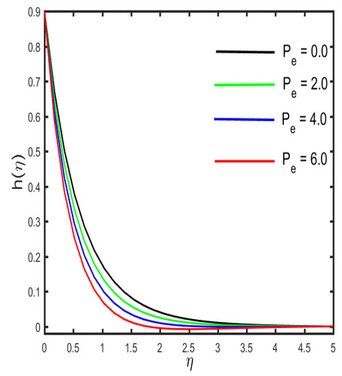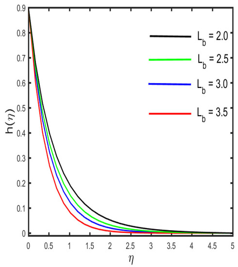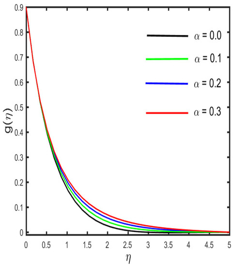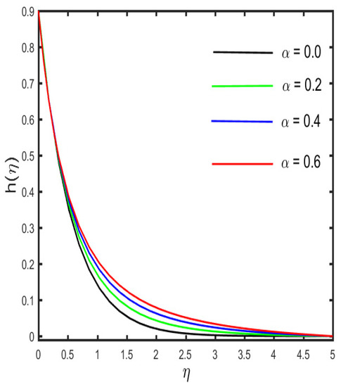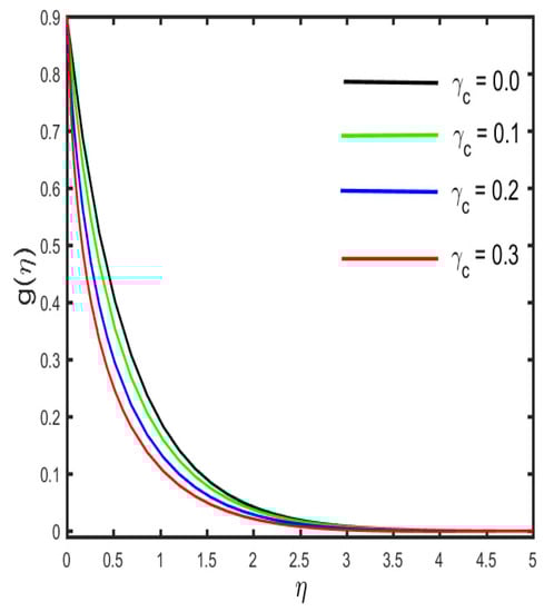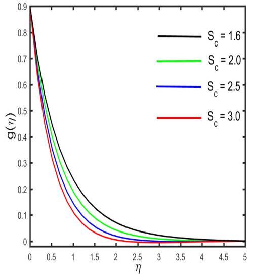 Figure 13, Figure 14, Figure 15, Figure 16 and Figure 17 illustrate the effects of various emerging parameters on the concentration sketch. The variation in the sketch against the various estimation of and (the mass relaxation parameter) is portrayed in Figure 13 and Figure 14. Figure 13 illustrates that higher values of boost the concentration sketch and the related thickness of the boundary layer. Further, it is designated that a stronger estimation of the mass relaxation parameter declines as the concentration profile and the associated boundary layer become thicker (see in Figure 14). It is interesting to note that the enhancement occurs in the concentration sketch against the escalation of , which is seen in Figure 15. Figure 16 represents the effect of (the concentration stratification) on the concentration distribution. It is visible in the figure that the reduction occurs in the sketch and the associated boundary layer thickness by the enhancement of . The characteristics of (the Schmidth number) on the concentration sketch is examined in Figure 17. It is sketched that the stronger estimation of declines as the nanoparticle concentration and corresponding boundary layer become thinner. Physically, by the enhancement of , mass diffusivity decays, and, as a result, the concentration sketch declines.