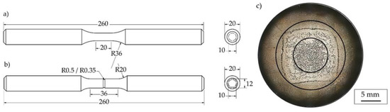 The specimens used in this investigation are presented in Figure 1. Figure 1a shows the unnotched specimen’s geometry, and Figure 1b the notched specimens. There were two types of notched specimens, whose only difference was the notch radius RN, the first one with a radius of RN = 0.35 mm and the second with a radius of RN = 0.5 mm. The circles present in the center of the micrograph in Figure 1c represent the size of the specimens used. As can be seen, the gauge length cross section of the specimens, represented by the smallest circle, was mostly in the internal microstructure of the bar, whereas the shafts have been composed of both of the microstructure types.