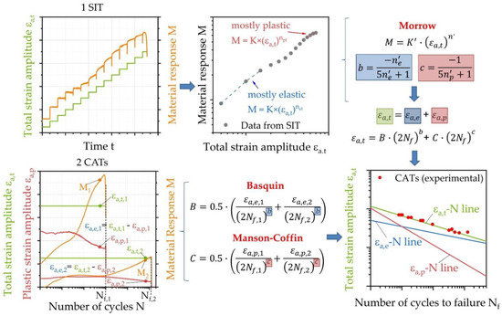 Figure 2 shows the calculation procedure for the StrainLife approach schematically, where a SIT and two CATs are needed. When the material response of the SIT, taken at the half of each step is plotted vs. the controlled value in a double-logarithmic scale, the relationship is divided into a part where either elastic strain or plastic strain is dominating. From this relationship and can be obtained, and using the empirical relationships established by Morrow [12], and can be calculated, representing the slopes of the and relationships respectively. Furthermore, with the , , values taken at the half of the lifetime from the two CATs, and its , the coefficients and can be calculated using Basquin [13] and Manson-Coffin [14] relationships.