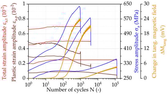 Three strain controlled CATs with total strain amplitudes of 0.25%, 0.5% and 0.7% are presented as an example in Figure 3, where the red line represents the controlled total strain amplitude , the blue the resulting stress amplitude , the brown line the plastic strain amplitude and the orange the change in tangential magnetic field ΔMtang.