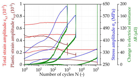 For metallic conductors, the resistivity ρ of a material can be used to characterize chemical and physical crystal lattice imperfections in the material. The resistivity of a material is inversely proportional to its mean free path of electrons, which at RT is dominated by the electron scattering from thermal vibrations of the crystal lattice (phonons) and at low temperature by the scattering of crystal lattice imperfections (chemical impurities, vacancies, dislocations) [15]. Therefore, the change in electrical resistivity of a material during fatigue tests can be used as an indication of its crystallographic defects. Changes in the cross section and length of the specimen’s gauge length during fatigue loading can be neglected and the change in electrical resistance ΔR measured along the minimum cross-section of the specimen can be used instead.