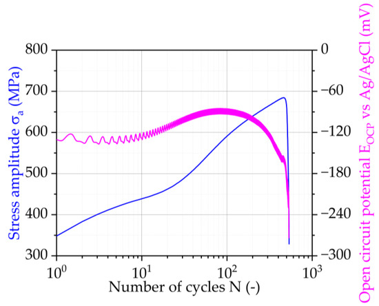 Figure 5 shows the result obtained from a CAT under reversed strain-controlled fatigue loading in distilled water, where the open circuit electrical potential EOCP has been recorded as well as the stress amplitude, showing, that those parameters are independent of the controlling strain and also obey different trends. While the material continuously hardens under cyclic loading, EOCP shows initially a similar trend, which then obviously changes due to additional reactions resulting between the specimen’s surface and the distilled water surrounding.