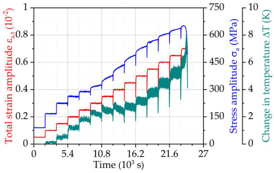 Temperature measurements can be used to characterize the fatigue behavior and damage evolution process of metals since the irreversible plastic deformation work is converted by approximately 90 to 95% into heat [17]. This heat is related to the released energy to a lower degree from dislocation movements’ processes, followed significantly from a material’s plasticity generated through an increasing number of slip bands and finally due to crack formation and propagation resulting from stress intensities at the crack tips and possibly also internal friction along crack borders [18].