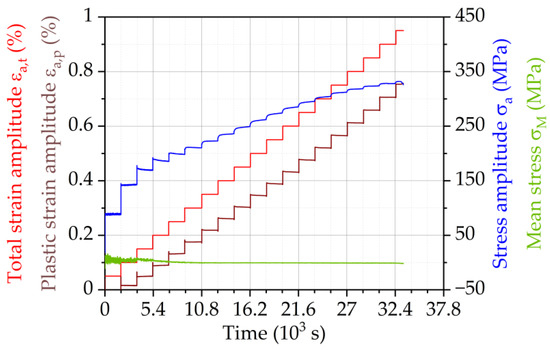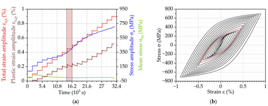 Figure 7a shows the results of the SIT conducted at RT (Specimen NA01). The red line represents the controlled total strain amplitude and the blue the resulting stress amplitude . The green line represents the mean stress , which is a consequence of the strain-controlled mode and the brown the plastic strain amplitude . It can be seen that at lower total strain amplitudes (0.05% to 0.3%), no material hardening or softening does occur, while from 0.35% onwards cyclic hardening is to be seen. Moreover, mean stresses mainly vanish from a total strain amplitude of 0.4% and above. Figure 7b shows the stress-strain hysteresis in the middle of each step. From these hystereses, it was concluded that from = 0.4% onwards plastic effects are clearly present. Based on this, the step at = 0.45% (shown in red) was chosen to represent the material under plastic strain and hence for the determination of the parameters in the three-component Chaboche model to be then used in the FE simulations to follow, the cycle used was cycle 9941.