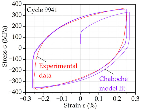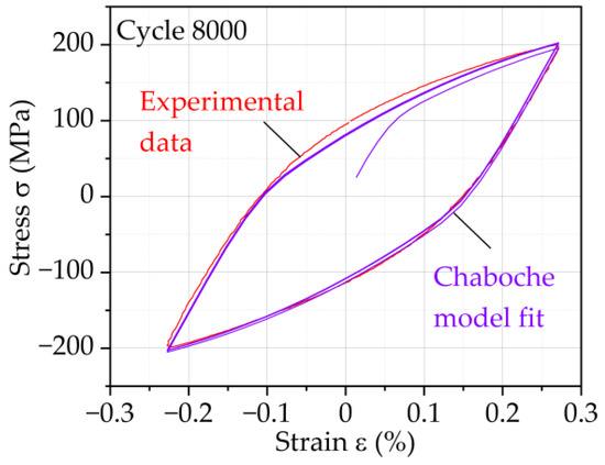 Using the materials data presented in Figure 7, the parameters for the Chaboche model were determined for RT (Table 2) and a hysteresis was simulated and compared with measured data as shown in Figure 9, where a good coincidence is to be seen.