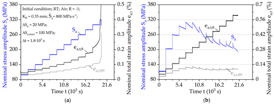 (a) Results of a nominal LIT at RT with = 20 MPa and = 100 MPa and (b) Results of a nominal total strain increase test at RT with = 0.05% and = 0.05%.