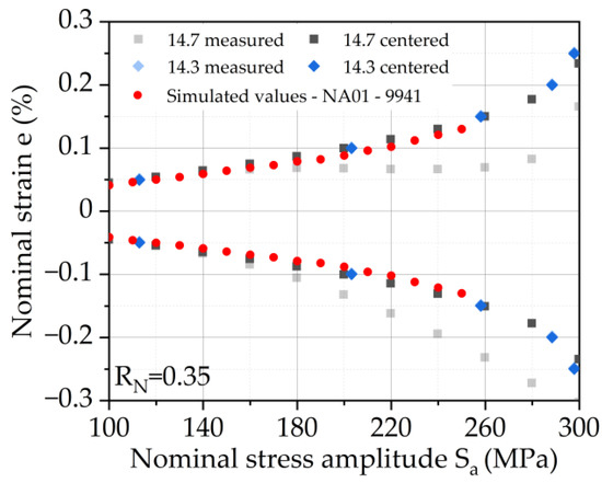 Figure 14 shows the comparison of the numerically calculated notch root strains for the specimen with a notch radius of RN = 0.35 mm for an SIT performed at RT, where the considered gauge length of the deformation transducer was 8 mm. The values marked in red were determined via the polynomial function derived from FEM calculations. The range of validity of this function extends over total strain amplitudes up to ~0.45%, allowing nominal stress amplitudes of up to = 200 MPa to be considered. The green curve was obtained using and Neuber’s equation in the form presented in Equation (7). It can be observed that the notch strains determined analytically are higher than those determined by FEM. Figure 15 shows the same comparison as described above, but now for the specimen with RN = 0.50 mm.