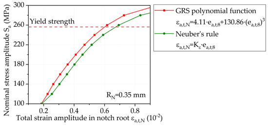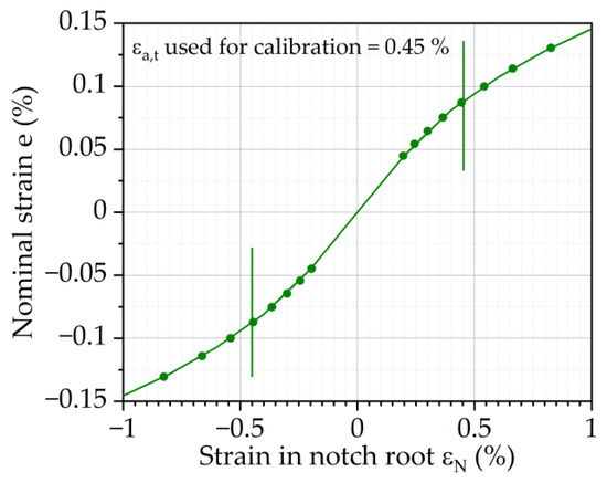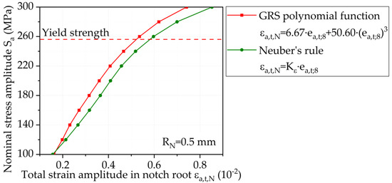 With the numerical simulation being available, strains in the notch root can be determined. Those strains have been plotted versus the nominal strains, where the result is shown in Figure 13. Following Neuber’s Equation (6), which can be simply written as