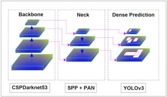 Over the latest four years, YOLO has been developed into five versions by accommodating improvement ideas given from the object detection community. The first three versions, i.e., YOLOv1 [31], YOLOv2 [12], and YOLOv3 [13], were developed by the original author of YOLO algorithm. For sure, the YOLOv3 [13] arrived at substantial performance improvements owing to the introduction of multi-scale features (FPN) [32], a better backbone network (Darknet53), and replacement of the SoftMax categorical loss function with the binary cross-entropy loss function. Thereafter, YOLOv4 [14] was released by another research group rather than the original YOLO authors. The overall network architecture of YOLOv4 consisting of three parts (i.e., backbone, neck, and head), which is implemented using YOLOv4 in this study, is shown in Figure 1. The YOLOv4 upgrades several options involved in the YOLOv3 algorithm [13], including the backbone called bags of freebies and bags of specials. It arrives at 43.5% AP (65.7% AP50) for the MS COCO dataset at a real-time speed of 65 FPS on Tesla V100.