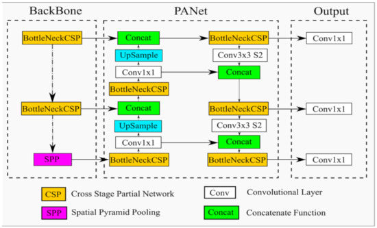 The YOLOv4 [14] followed by YOLOv5 [15] was introduced within a month interval. YOLOv5 [15] was welcomed by the object detection community because it is smaller in size, higher in speed, and comparable in performance against to YOLOv4 [14], even if it does not arrive at outstanding algorithmic innovation. The overall network architecture of YOLOv5 consisting of three parts (i.e., backbone, PANet, and output), which was fully implemented using Python (PyTorch), is presented in Figure 3. An ordinary object detector is composed of several parts (i.e., backbones, neck, and heads, etc.). A neck includes either additional blocks (i.e., SPP, ASPP, RFB, SAM), or path-aggregation blocks (i.e., FPN, PAN, NAS-FPN, fully connected FPN, BiFPN, ASFF, SFAM). In YOLOv4, SPP + PAN is used in a neck part. The comparison of SPP + PAN with other blocks in the Neck part is beyond the scope of this study.