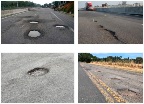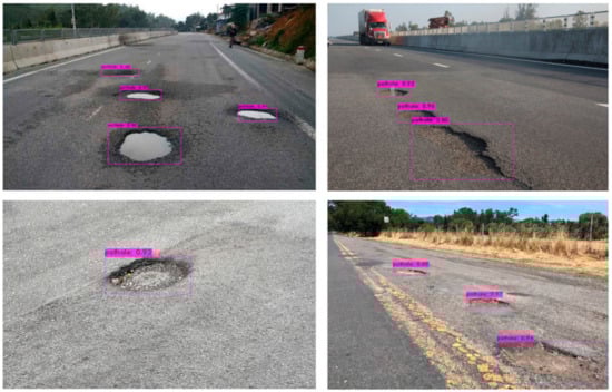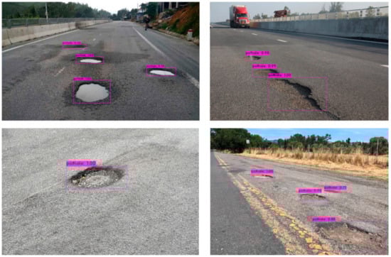 The dataset consists of the images and their corresponding labels. The dataset was divided into training, validation, and testing subsets each of which ratio is 70%, 20%, and 10%, respectively. Typical pothole images in the testing subset are shown in Figure 4.