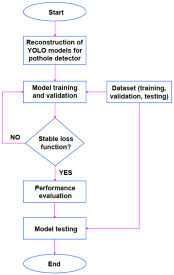 Figure 5 shows the sequence of actions to perform tasks in order to detect potholes in the road surface. In the first step, a pothole dataset was collected from the previous research and the various YOLO models were reconstructed to be suitable for the tasks of pothole detection. Next, the models were trained and validated until the loss function reached a steady-state line, which the average loss insignificant changed. The quality of object detection, which requires to draw a bounding box around each detected object in the image, was confirmed by evaluating the performance of an object detector using three metrics (i.e., precision, recall, and mAP) as shown in Equations (1)–(3) [15].