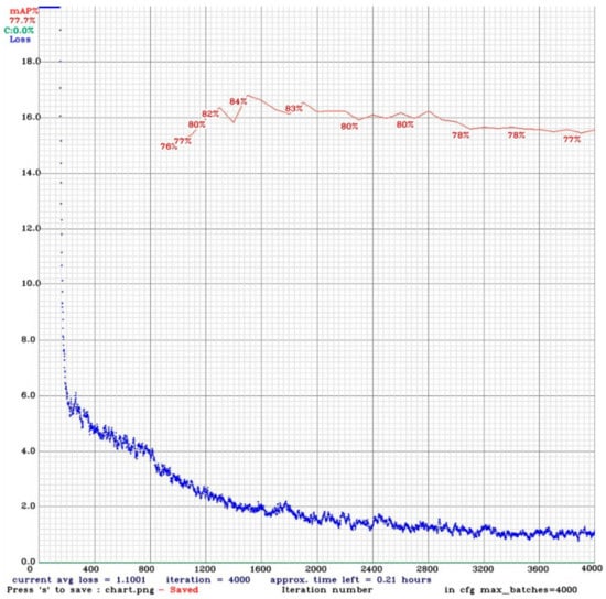 Pre-trained weight models and suitable filters of convolutional layers were used for YOLOv4 and YOLOv4-tiny in the training process. The weight parameters of models are stored after every thousand iterations. YOLOv4 and YOLOv4-tiny models have the same loss function divided into three parts: class loss, location loss, and confidence loss [16]. The loss and mAP_0.5 values obtained after each iteration are shown in Figure 6 and Figure 7, respectively. The training process of YOLOv4 runs 4000 epochs and takes more than seven hours for the dataset as shown in Figure 6. It appears that the training process is stable because an average success value of is 77.7% given a mAP_0.5. The training process of YOLOv4-tiny runs 6000 epochs and takes only about 1 h 7 min for the identical dataset as shown in Figure 7. For sure, the training process of YOLOv4-tiny model takes much shorter time than that taken by the YOLOv4 model. The training process of YOLOv4-tiny is more stable than that of YOLOv4 because then average success value is 78.7% which is slightly higher than that of the YOLOv4 model, given the identical mAP_0.5. Comparatively, a focal loss function addresses class imbalance while training for object detection. Focal loss applies a modulating term to the cross-entropy loss to focus learning on hard negative examples. It is a dynamically scaled cross entropy loss, where the scaling factor decays to zero as confidence in the correct class increases. Intuitively, this scaling factor can automatically down-weight the contribution of easy examples during training and rapidly focus the model on hard examples.