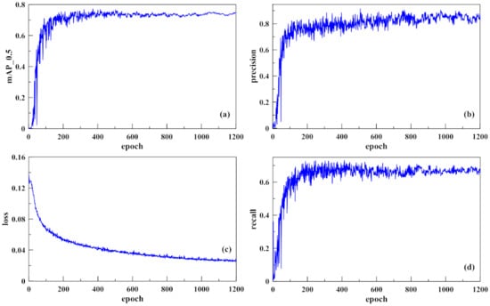 The training process of the YOLOv5s model took about 1 h 43 min to run 1200 epochs. The training result converged and stabilized after about 800 epochs, which were shown in the curves as given in Figure 10. Given the values of mAP_0.5, loss, precision, and recall were 0.748, 0.026, 0.82, and 0.68 at the 1200th epoch as shown in Figure 10a–d, respectively.