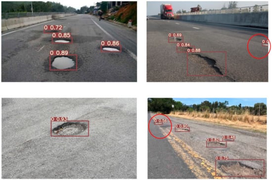 After the training process, YOLOv5s trains the model using the testing dataset images which were not employed during the training. Each pothole is highlighted using a bounding box having a label presenting the value of its corresponding confidence as shown in Figure 11. The YOLOv5s model identifies defects on road surface with confidence values ranging from 0.56 to 0.93. It is noted that this model gets the error detection of pothole in some cases as a red circle marked in the images.