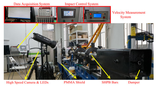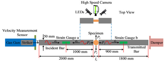 The experimental system was mainly composed of the SHPB bars (Luoyang Liwei Technology CO., Ltd., Luoyang, Henan, China), control system (Luoyang Liwei Technology CO., Ltd., Luoyang, Henan, China), data acquisition system (Jiangsu Donghua Testing Technology Ltd., Jingjiang, Jiangsu, China), and high-speed photography system (IX-Cameras Inc., Rochford, Essex, UK), as shown in Figure 1. The bars were made from steel with a 206 GPa Young’s modulus and 5160 m/s elastic wave velocity. The length and diameter of the striker bar, the incident bar, and the transmission bar were 400 mm × 50 mm, 2000 mm × 50 mm, and 1800 mm × 50 mm, respectively. At the other end of the transmission bar, a damper was arranged to absorb the transmitted wave. The dynamic resistance strain gauges (DC-97A), which were connected to an oscilloscope, were mounted at midpoints of the incident and transmission bars. The deformation signals were stored by the stress pulse recorder. For capturing the images of fracture process, the high-speed camera (i-speed 716, IX-Cameras Inc., Rochford, Essex, UK) was arranged in the direction perpendicular to the circular section of rock specimen. Two sets of lights (LEDs) were used as illuminations for the camera, providing continuous light output of 200 W power. Under this configuration, images were captured at a frame rate of up to 100,000 fps (frames per second) with a resolution of 672 × 216 pixels [28]. In order to avoid damage to the equipment by the ejection of rock fragments, the specimen was placed in a recycling box with a shooting window, and a polymethyl methacrylate (PMMA) shield was placed between the camera and specimen for protection.