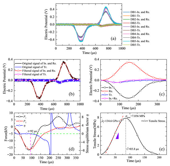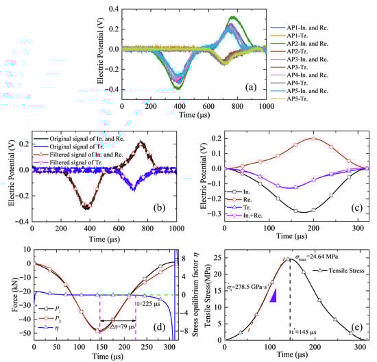 Experimental results for the Andesite specimen. (a) Raw signals of the Brazilian test. (b) Raw and filtered signal at a striking velocity of 4.88 m/s. (c) The incident (In.), reflected (Re.), transmitted (Tr.), and superposed (In. + Re.) waves. (d) Verified stress equilibrium. (e) Determination of dynamic tensile strength and loading rate.