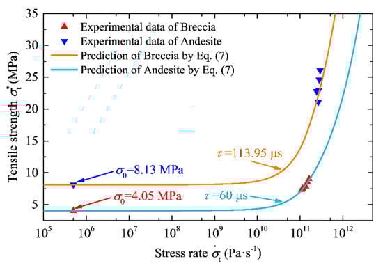 The rate-dependent effect of dynamic tensile strength of the Breccia and Andesite was fitted and predicted by the incubation time criterion mentioned in Section 3. The scatters in Figure 5 are the dynamic tensile strengths determined by the dynamic Brazilian tests, also including the quasi-static strength of Breccia (σ0 = 4.05 MPa) and Andesite (σ0 = 8.13 MPa). Among them, the stress rate of the Breccia specimens was distributed in the range of 108.8~161.6 GPa·s−1, and that of the Andesite specimens was distributed in the range of 242.6~292.9 GPa·s−1. Fitting Equation (7) to the experimental data using the least squares method, we obtained the incubation times of Breccia and Andesite, which were 61.5 and 124.3 μs, respectively. The predictions of the dynamic tensile strengths of the two igneous rocks under different stress rates are shown as the continuous lines in Figure 5. Their variations indicated that the tensile strength enhancement induced by stress rate was determined by quasi-static strength and incubation time.