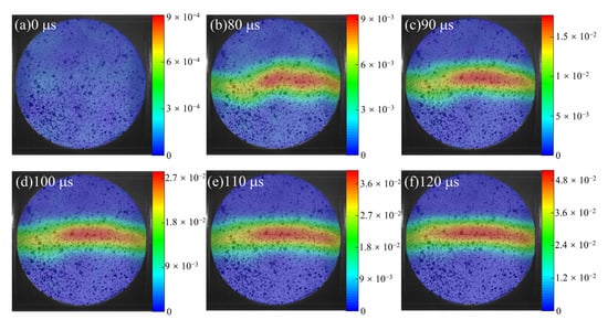 Full-field strain of the Breccia specimen at 4.86 m/s striking velocity: (a) 0 μs; (b) 80 μs; (c) 90 μs; (d) 100 μs; (e) 110 μs; (f) 120 μs.
