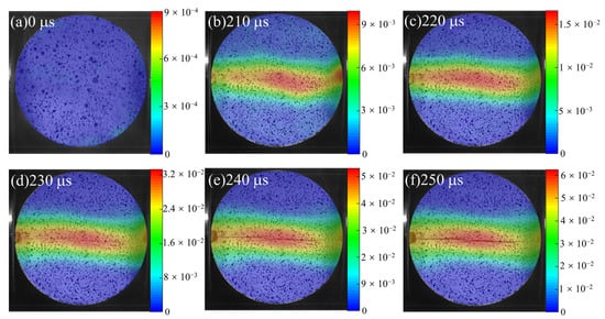Full-field strain of the Andesite specimen at 4.88 m/s striking velocity: (a) 0 μs; (b) 210 μs; (c) 220 μs; (d) 230 μs; (e) 240 μs; (f) 250 μs.