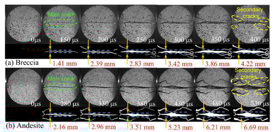 With the opening of the main crack on the surface of the specimen, secondary cracks dominated by shear stress gradually occurred at the contact points between the specimen and elastic bars. Figure 8 shows the process of main crack opening and secondary crack initiation and propagation in the typical experimental results for the Breccia and Andesite specimens. The high-speed images were binarized to obtain the pixel information of the cracks. Then, the width of the main crack at different moments was measured by pixel information, as shown in Figure 8. According to the widths of the main crack at different moments, the average opening velocities of the main crack in 250 μs shown in Figure 8 were 12.85 m/s for the Breccia specimens at 4.86 m/s striking velocity and 20.94 m/s for the Andesite specimens at 4.88 m/s striking velocity.
