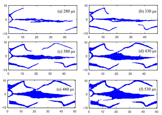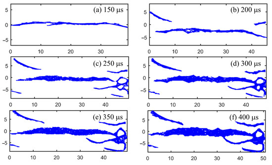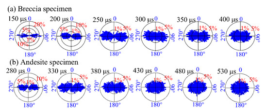Therefore, we made a quantitative characterization of the cracking morphology with the statistical length and orientation information of the fracture traces. We defined a ratio of the length of one fracture trace to the sum of all the fracture trace lengths at the current moment as the normalized length. The distribution of the normalized lengths of the fracture traces along the Y-axis deflection angle (the north is 0) was statistically analyzed and was plotted as the rose diagram shown in Figure 11. The Y-axis deflection angle was counted from both clockwise (0~180°) and counter clockwise (180°~360°) directions; thus, these rose diagrams are centrally symmetric. In the early stage of the fragmentized processes (150 μs in Figure 11a and 280 μs in Figure 11b), the normalized length of the fracture traces corresponding to the main crack in the horizontal direction (Y-axis deflection angles are 90° and 270°) is dominant. With the main crack opening width increasing and secondary cracks expanding, the fracture traces in the vertical direction gradually increased. At the same time, the normalized lengths with the Y-axis deflection angle at 0° and 180° gradually increased. Thus, the capability of FracPaQ to characterize the fragmentized processes was validated.