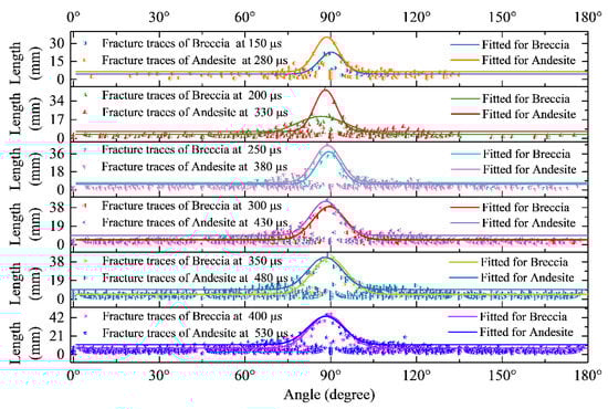 Then, the length-orientation scatter data of Breccia and Andesite at typical moments were fitted by Equation (8), and the fitted parameters are shown in Table 1. The results showing the fracture characteristics of the Brazilian specimens in fragmentized processes were in accordance with the Gaussian function. In Figure 12, the Y-axis is the fracture traces length, and the X-axis is the clockwise deflection angle of the fracture traces from 0° to 180°. Therefore, y0 in Equation (8) can be defined as the statistical crack width, and the maximum value of Equation (8) can be defined as the statistical crack length. In summary, the main crack expanding in the center of the Brazilian specimens that is generally accepted can be characterized by fitting the length-orientation of fracture trace using the Gaussian function.