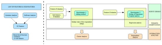 Aiming to single out the features’ weights on the basis of the prototypes’ ratings, a regression model was performed [35,36,37,38,39]. Input data of this model were the dichotomous variables representing the presence (i.e., level +1) or the absence (i.e., level −1) of a functionality within every prototype. On the other hand, the response variable of the model was the rating of every prototype given by every respondent. The regression coefficients of the estimated model represented the features’ weights. The only significant terms were considered after using a stepwise regression, which was able to select the significant factors (i.e., features) with respect to their contribution to the total variability of responses. Finally, on the basis of the methodology proposed by Barone et al. [37,40], the normalized weights of features were calculated from the estimated regression model coefficients.